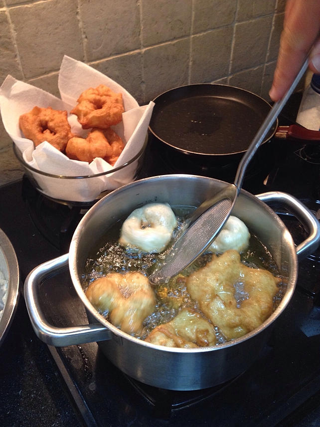 בסיום ההתפחה מחממים את השמן על אש בינונית. אפשר ונכון כמובן למדוד את הטמפרטורה ע"י טבילת מד חום, היא צריכה ליהות בסביבות 180-190 מעלות, אני מעדיף פשוט לזרוק לתוך השמן חתיכה קטנטנה של בצק ולראות עם נוצרות מיד בועות מסביב, מה שאומר שהחום מספיק לטיגון והבצק לא יספוג יותר מדי שמן.